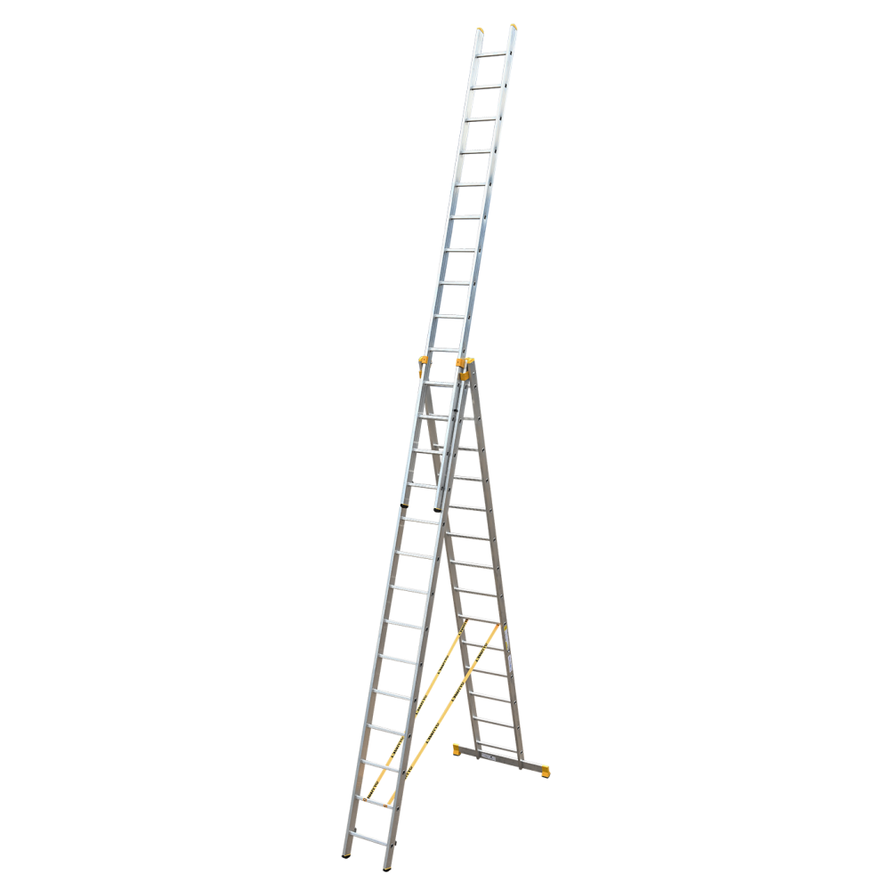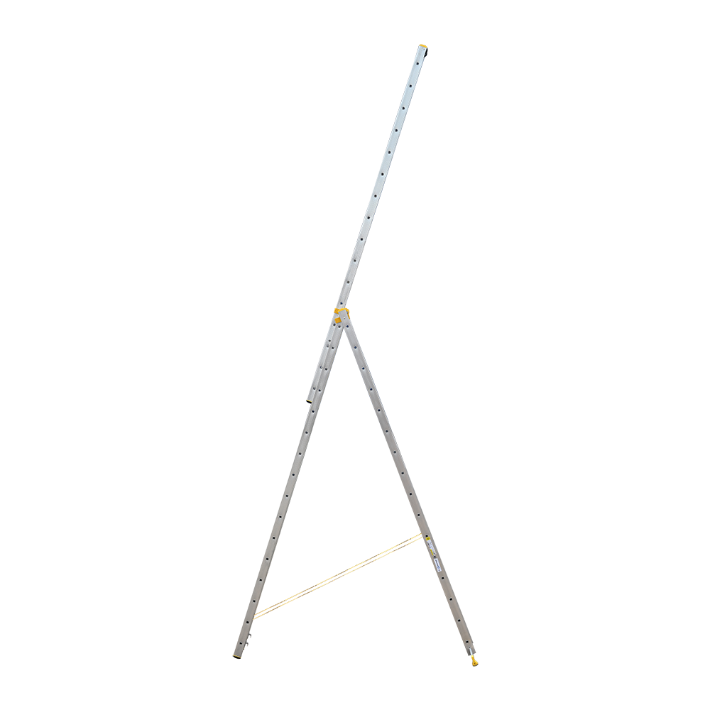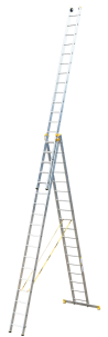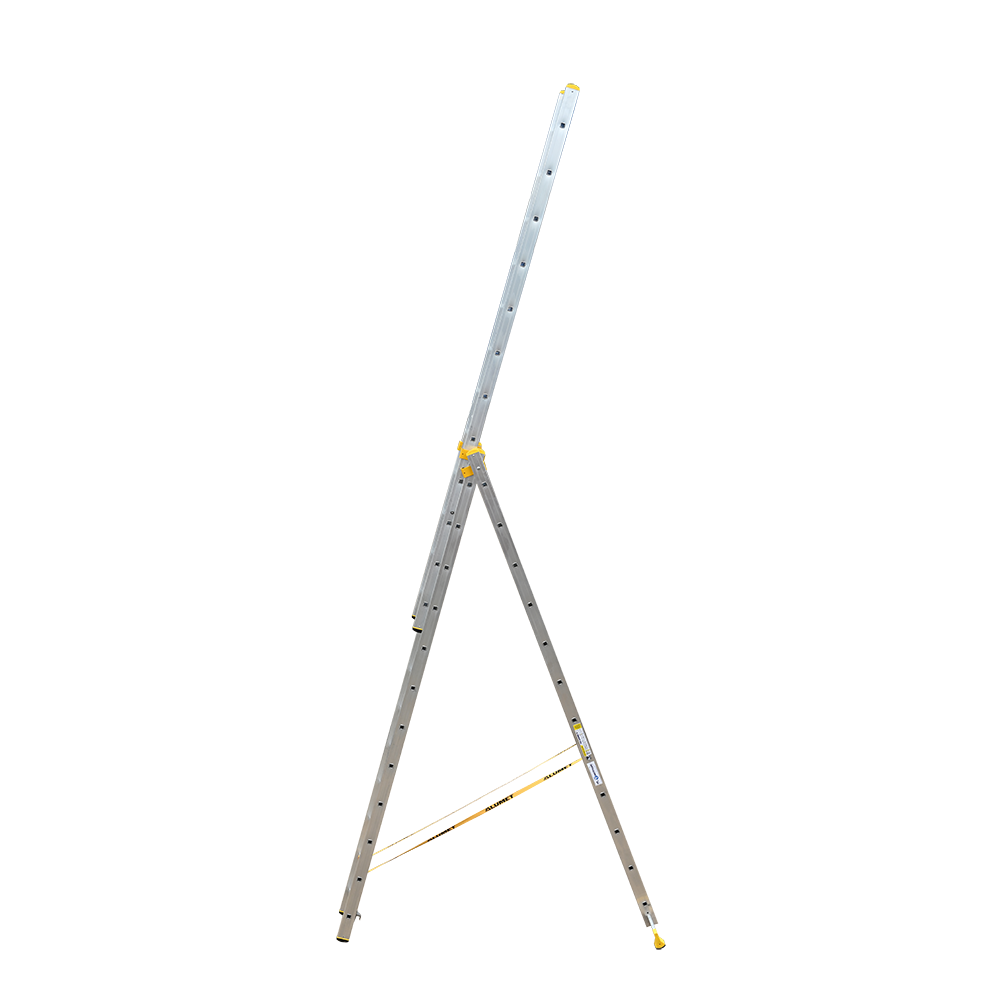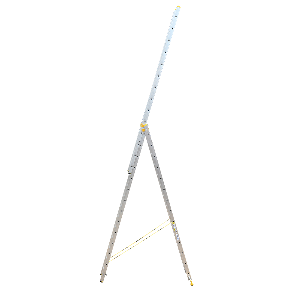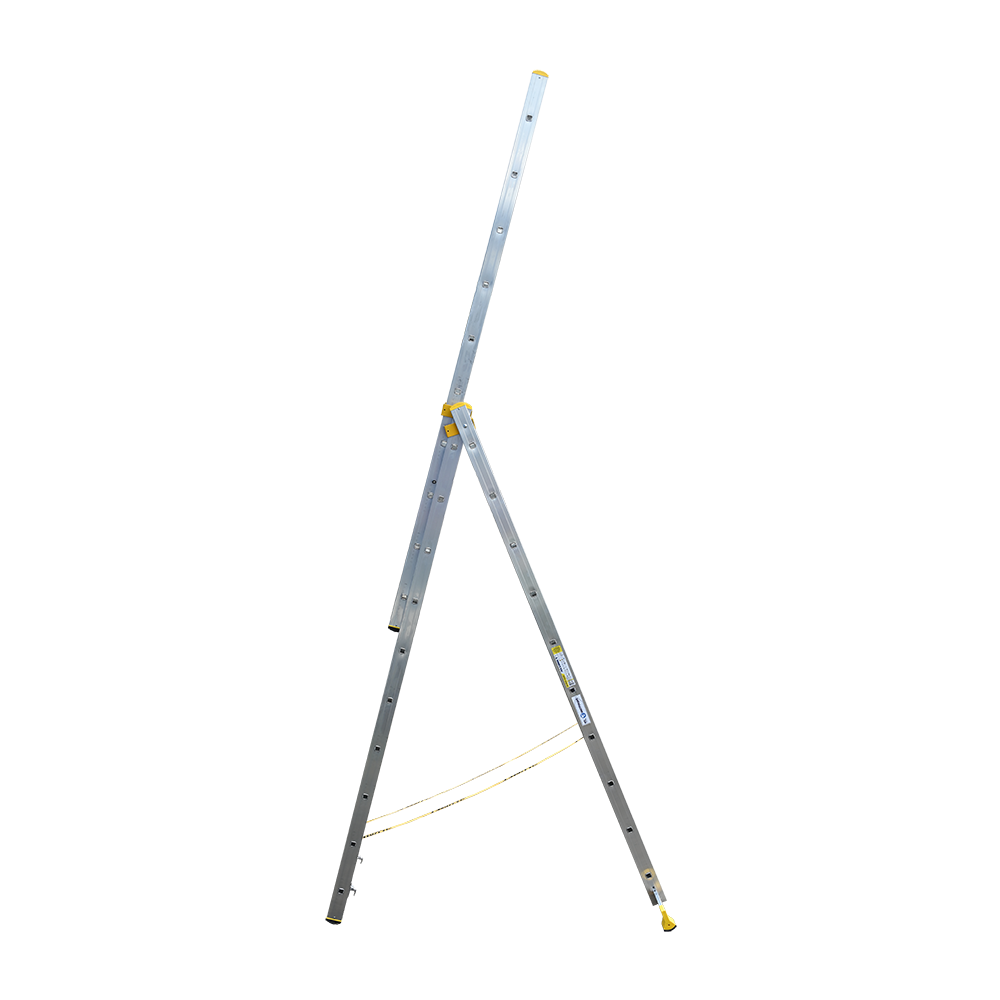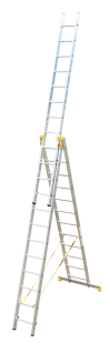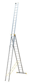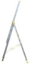 Универсальность данной лестницы заключается в том, что она может использоваться как раздвижная приставная лестница из трех частей и как свободностоящая стремянка (перевернутая русская буква «У»). Более того третья секция является съемной, и ею можно пользоваться отдельно как приставной лестницей, а оставшаяся часть при этом представляет двухсекционную универсальную лестницу. Эта лестница является по праву наиболее универсальной из всех лестниц, и несмотря на необходимый попарный перехлест секций как в положении «приставная лестница» так и в положении «стремянка», что усложняет, утяжеляет и поэтому удорожает ее, является самой популярной по продаваемости из-за своей исключительной универсальности.