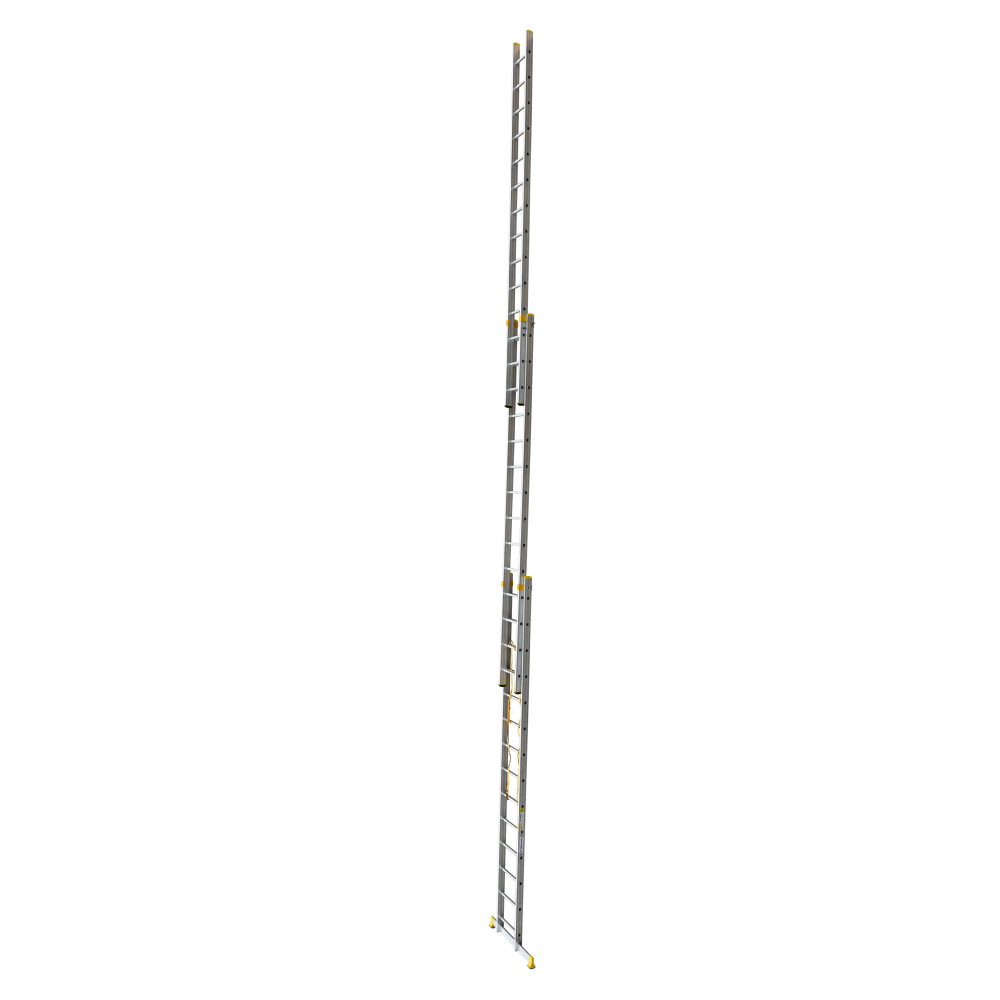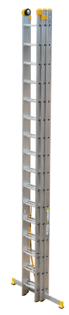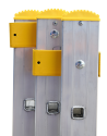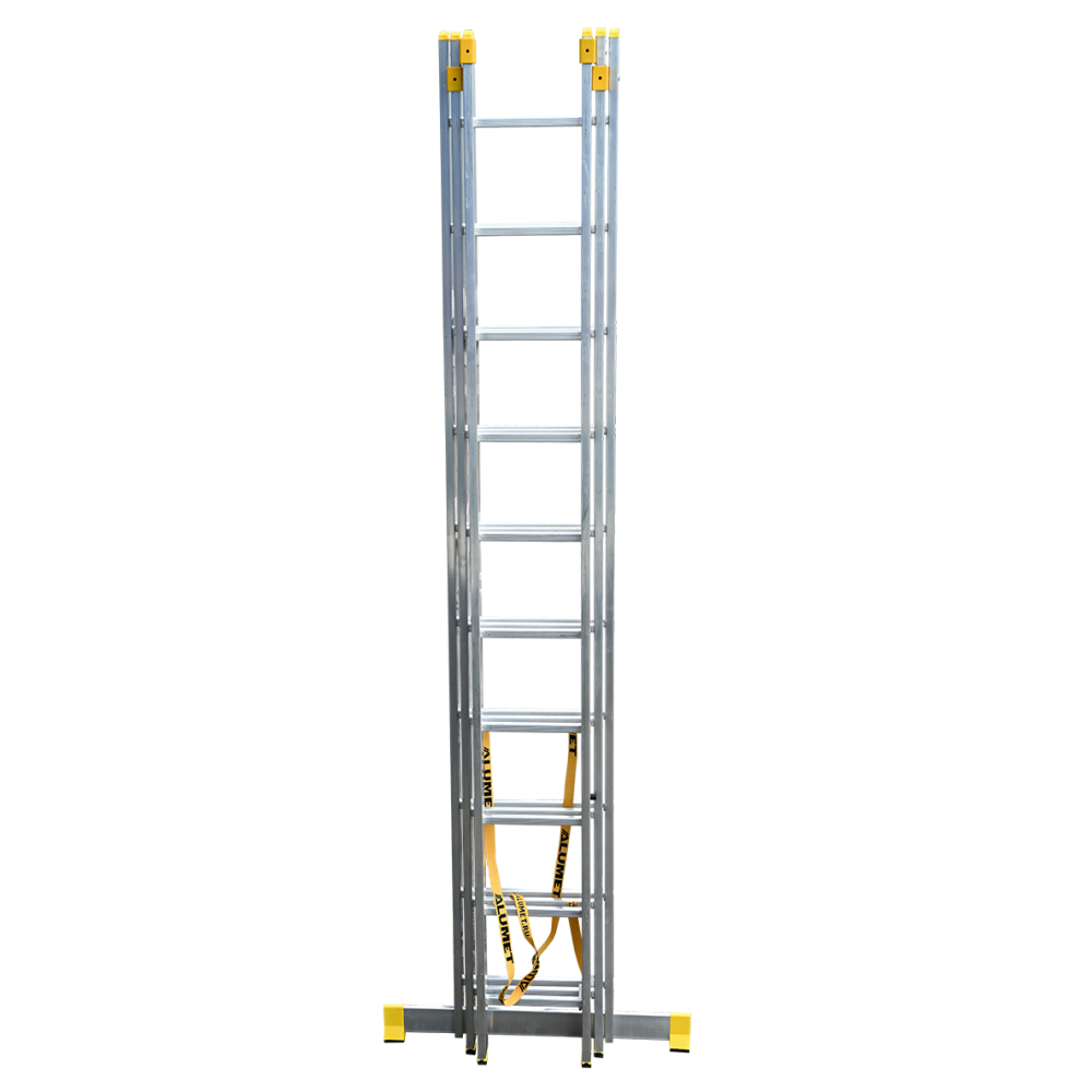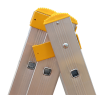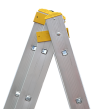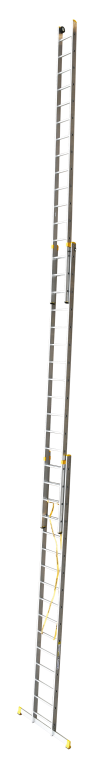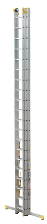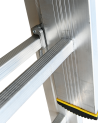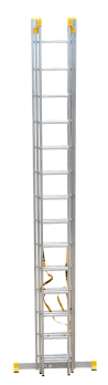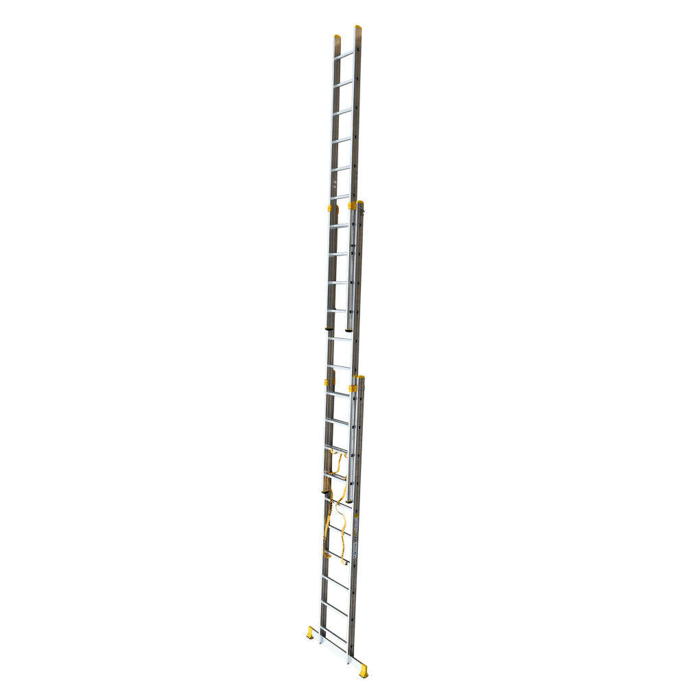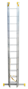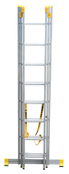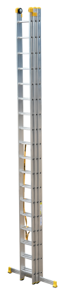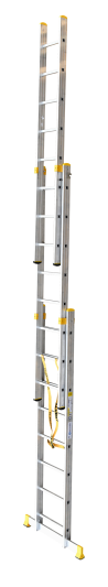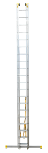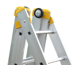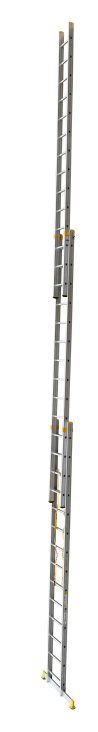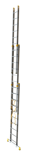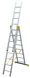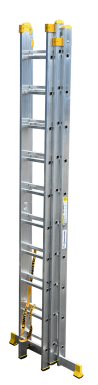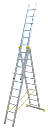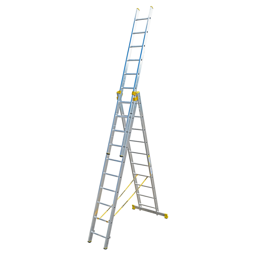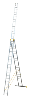 Универсальность данной лестницы заключается в том, что она может использоваться как раздвижная приставная лестница из трех частей и как свободностоящая стремянка (перевернутая русская буква «У»). Более того третья секция является съемной, и ею можно пользоваться отдельно как приставной лестницей, а оставшаяся часть при этом представляет двухсекционную универсальную лестницу. Эта лестница является по праву наиболее универсальной из всех лестниц, и несмотря на необходимый попарный перехлест секций как в положении «приставная лестница» так и в положении «стремянка», что усложняет, утяжеляет и поэтому удорожает ее, является самой популярной по продаваемости из-за своей исключительной универсальности.