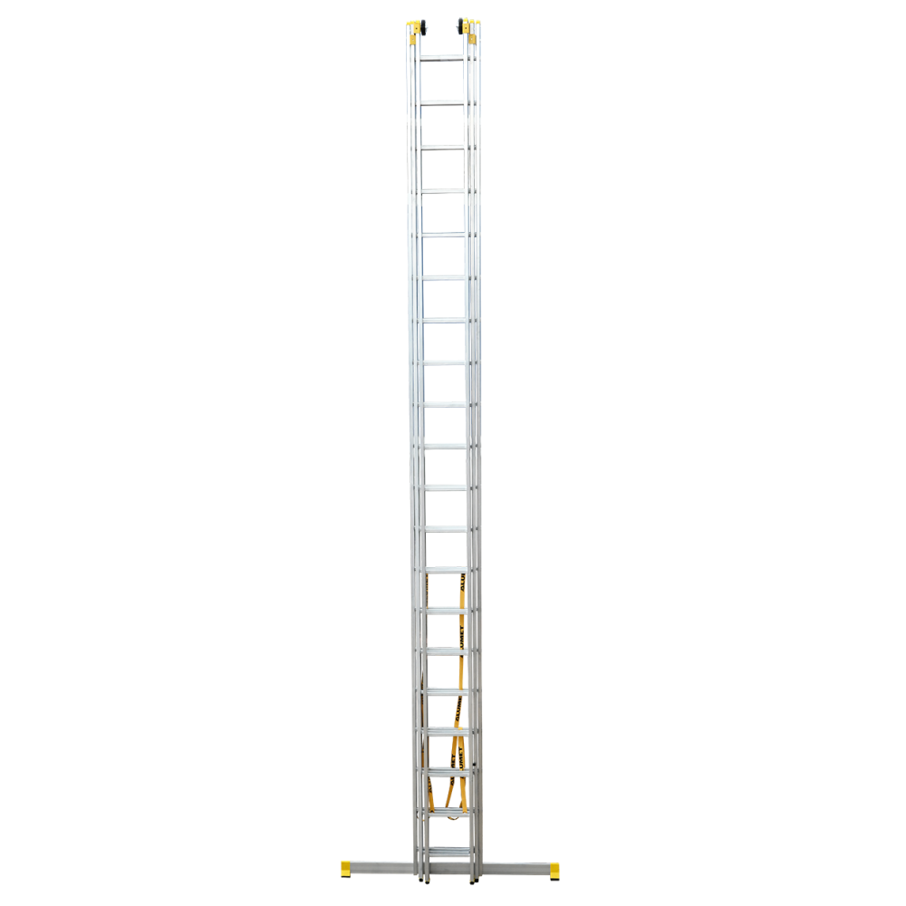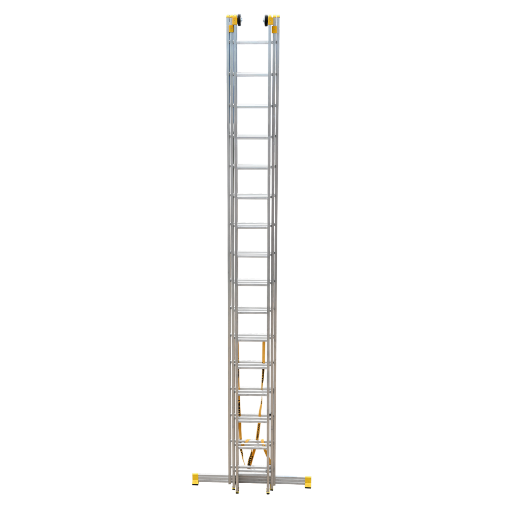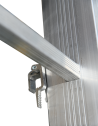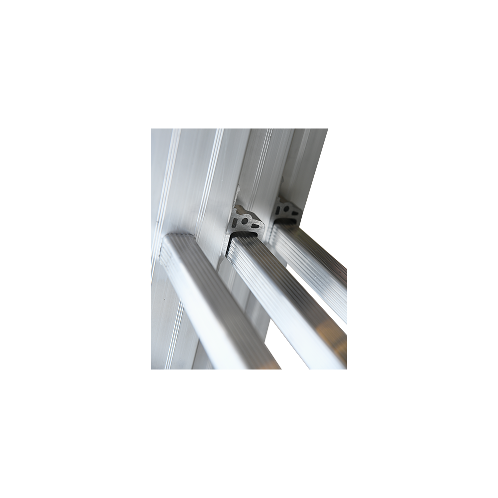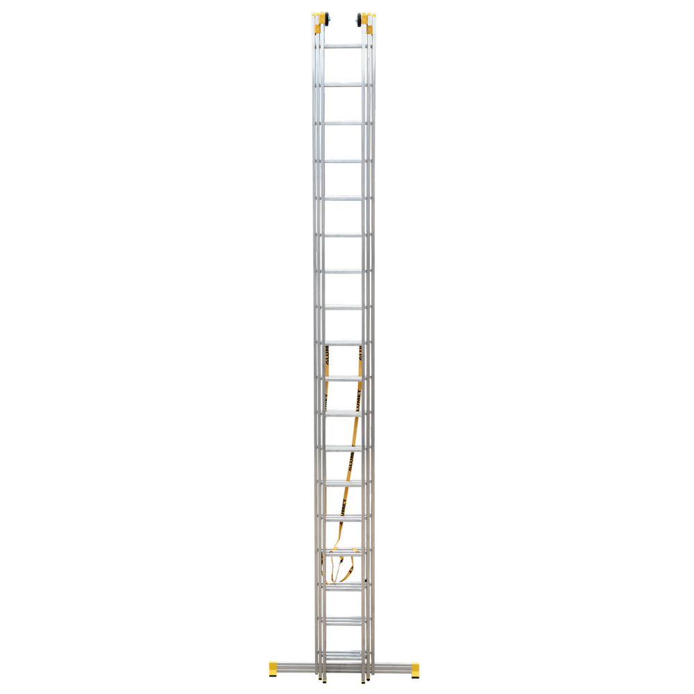 Универсальность данной лестницы заключается в том, что она может использоваться как раздвижная приставная лестница из трех частей и как свободностоящая стремянка (перевернутая русская буква «У»). Более того третья секция является съемной, и ею можно пользоваться отдельно как приставной лестницей, а оставшаяся часть при этом представляет двухсекционную универсальную лестницу. Эта лестница является по праву наиболее универсальной из всех лестниц, и несмотря на необходимый попарный перехлест секций как в положении «приставная лестница» так и в положении «стремянка», что усложняет, утяжеляет и поэтому удорожает ее, является самой популярной по продаваемости из-за своей исключительной универсальности.